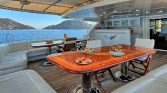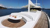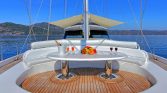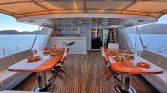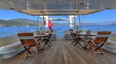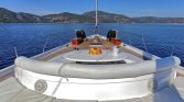 Life aboard Angelo 2 unfolds across multiple levels, each offering its own character and charms. The spacious aft deck, shaded by a crisp bimini top, quickly becomes the heart of your floating home. Here, around a generous dining table, you’ll gather for meals that become memories—perhaps grilled sea bass caught that morning, or lamb kebabs fragrant with Turkish spices, prepared by your private chef and served as the golden light of late afternoon stretches across the water .