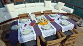 The Aft Deck serves as the heart of your floating home. Shaded and spacious, it hosts the dining table where you’ll gather for meals that become legends. Breakfast as the harbor stirs to life bread still warm from some village oven, honey that tastes of mountain thyme, olives cured in family recipes passed down for generations . Lunch at anchor in a secret bay, mezes appearing as if by magic, grilled fish that was swimming hours ago . Dinner under stars, candlelight flickering, laughter mingling with the gentle lap of waves .