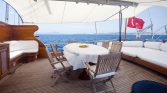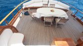 The Aft Deck serves as the heart of your floating home. Shaded by a crisp canvas bimini, it hosts the oval dining table where you’ll gather for meals that become legends. Breakfast as the harbor stirs to life—bread still warm from some village oven, honey that tastes of mountain flowers, olives cured in recipes older than anyone remembers . Lunch at anchor in a secret bay, mezes appearing as if by magic, boys too busy swimming to eat but suddenly ravenous when the food arrives . Dinner under stars, candlelight flickering, the kind of unhurried meals that families remember .