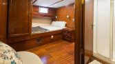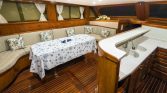 The interior saloon offers a gracious haven when you seek shelter from the midday sun. Spacious and welcoming, it features a bar, dining table, comfortable seating, music system, and color TV . Large windows keep you connected to the ever-changing seascape, while the separate crew quarters ensure your privacy throughout the charter .