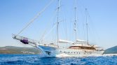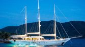 Gulet Bella Mare built in 2008 by Bodrum Shipyards, she’s been transformed through refits in 2021 and 2023 into something genuinely different. Her interior isn’t the usual mahogany—it’s a blue-grey finish with marble accents in the bathrooms that feel more like a boutique hotel than a boat . She stands out because she chose to.