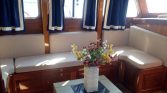 The interior of the yacht offers a welcoming and practical living space where guests can relax during their journey. The salon is equipped with a flat-screen television, music system, and Bluetooth connectivity, allowing guests to enjoy entertainment or listen to their favorite music while cruising. Air conditioning is available on board, ensuring a comfortable environment during warm summer days and evenings.