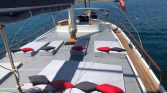 Outdoor living is a highlight on Gulet Bodrum Queen. The aft deck features a spacious dining area where guests can enjoy freshly prepared Mediterranean meals prepared by the onboard chef. The foredeck offers large sunbathing areas with comfortable sun mattresses, perfect for relaxing under the Mediterranean sun. In addition, the yacht features a flybridge, providing an elevated space where guests can enjoy panoramic views of the surrounding coastline while cruising.