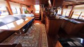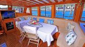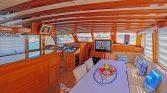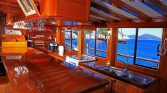 Inside, the gulet offers a welcoming salon area designed for relaxation and socializing. Guests can enjoy entertainment through a flatscreen TV, DVD player, Bluetooth audio system, and in some versions a PlayStation 3. The interior also includes a bar area, while the galley is fully equipped with modern appliances such as a coffee machine, ice maker, refrigerator, freezer, oven, and wine cooler, allowing the onboard chef to prepare delicious Mediterranean meals.