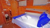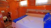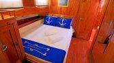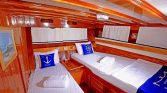 The yacht accommodates up to 12 guests in 6 comfortable cabins, consisting of 2 double cabins and 4 twin cabins. This layout is particularly convenient for families, groups of friends, or charter groups that prefer separate beds. Each cabin features a private en-suite bathroom with spacious shower cubicles and air conditioning, typically available for 8–12 hours per day, providing comfort during warm summer nights.