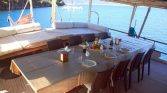 Outdoor spaces are designed for relaxation and enjoying the sea views. Guests can lounge on sun beds, relax under sun awnings and a bimini for shade, or enjoy refreshing moments under the deck shower after swimming. The deck layout also provides plenty of space for social gatherings, meals, or simply relaxing while cruising along the coastline.
