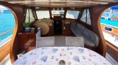 Inside, the yacht has a cozy and functional layout. The interior salon provides a relaxing space with a music system featuring Bluetooth and iPod connectivity, allowing guests to enjoy their favorite playlists while cruising. Additional amenities include Wi-Fi connection, a minibar, ice maker, and VHF radio, while the galley allows the onboard chef to prepare fresh meals throughout the charter.