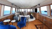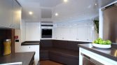 Inside, the salon offers a stylish and relaxing living area where guests can unwind after a day at sea. The yacht is equipped with Wi-Fi, DVD players, a music system, and a fully stocked bar, allowing guests to enjoy entertainment and refreshments at any time. The galley includes modern appliances such as a dishwasher, refrigerator, freezer, and washing machine, ensuring convenience during longer charters.