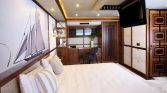 The yacht accommodates up to 8 guests in 4 spacious cabins, including two master double cabins and two double cabins. Each cabin is designed with attention to detail and features luxurious en-suite bathrooms with marble finishes, creating a comfortable and sophisticated atmosphere. One of the yacht’s unique design elements is its flat-screen televisions hidden in the cabin ceilings, providing modern entertainment while maintaining a clean and minimalist interior aesthetic. Full air conditioning throughout the yacht ensures a pleasant environment during every stage of the journey.