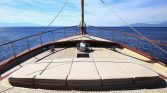 The outdoor spaces on Gulet Daglarca are designed for relaxation and socializing. The aft deck features a custom horseshoe-shaped seating area, providing a comfortable setting for al fresco dining or evening gatherings while enjoying sea views. The foredeck offers sun beds and shaded areas, ideal for sunbathing or relaxing while cruising between beautiful bays.