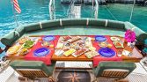 For guests who enjoy water activities, the yacht includes several water sports options, such as a kayak, snorkeling sets, water skis, and a dinghy with an outboard engine for exploring nearby beaches and coves.