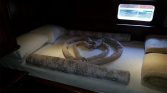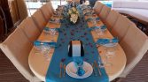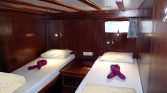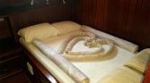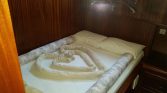 The yacht can accommodate up to 12 guests in 6 cabins, with flexible cabin arrangements depending on the charter configuration. These layouts may include four double and two twin cabins, five double and one twin, or even six double cabins. Each cabin is equipped with its own private en-suite bathroom with shower, ensuring comfort and privacy for all guests. Air conditioning is available for approximately 4–6 hours per day, helping maintain a pleasant environment during warm summer evenings.