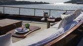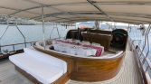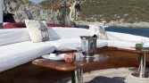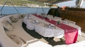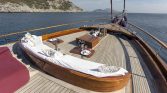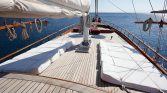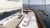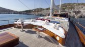The yacht’s outdoor spaces are ideal for enjoying the beauty of the sea. The foredeck features comfortable sun mattresses for sunbathing, while the aft deck offers a shaded dining area where guests can enjoy freshly prepared meals while taking in stunning sea views. A deck shower is also available for refreshing after swimming in the crystal-clear waters.