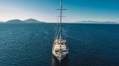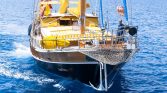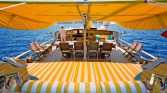 The yacht offers generous outdoor spaces designed for relaxation and enjoying the beautiful Mediterranean scenery.