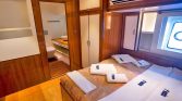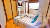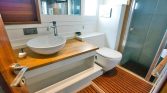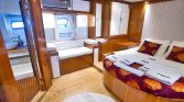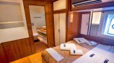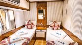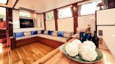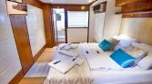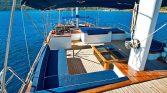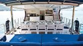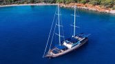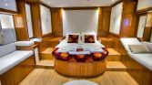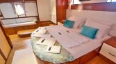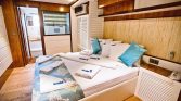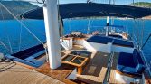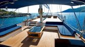 The flybridge offers panoramic views, a perfect setting for sunbathing or enjoying alfresco meals, while the drop-down swim platform ensures seamless access to the turquoise waters for swimming and water sports. The gulet’s open decks are equipped with sun mattresses, shaded seating, and a dedicated relaxation area, ideal for social gatherings or intimate moments at sea.