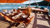 One of the yacht’s most unique design features is the front-deck galley, which helps prevent cooking odors from entering guest areas. Another highlight is the flat-deck design, which creates large open spaces on deck for relaxation, sunbathing, and socializing. Guests can enjoy the comfortable sun mattresses and deck seating areas, perfect for taking in panoramic views of the turquoise waters and surrounding coastline. A deck shower is also available for refreshing after swimming.