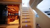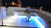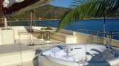 The highlight of the yacht is undoubtedly the flybridge, where guests can unwind in the jacuzzi, sunbathe in privacy, or enjoy open-air dining with breathtaking views of the coastline.
