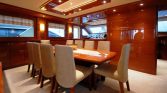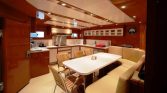Inside, the salon is modern, bright, and inviting. It includes a spacious seating area, a formal dining table, and a large flat-screen TV, creating a comfortable environment for relaxing after a day at sea.