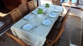 One of the yacht’s most distinctive features is the expansive aft deck with a flexible dining layout, allowing the space to transition effortlessly from relaxed daytime lounging to elegant evening dining or private celebrations under the stars. Whether you are hosting a special occasion or enjoying an intimate dinner, the atmosphere is nothing short of exceptional.