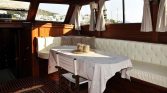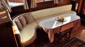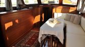 The interior saloon includes a dining table and a comfortable seating area, along with entertainment features such as an LCD TV, DVD player, and music system. Her interior design keeps the classic gulet spirit alive while offering the convenience needed for a comfortable stay onboard.